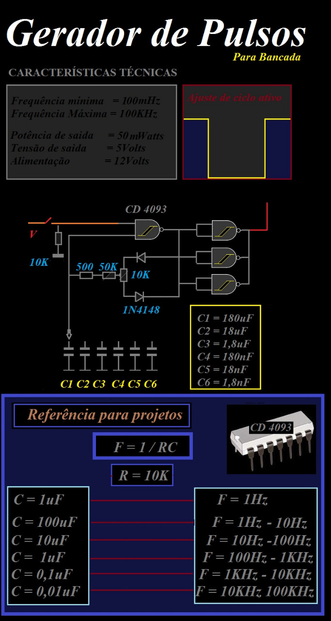 Aplicação do CI CD4093 como gerador de pulsos para sua bancada ou experiências.